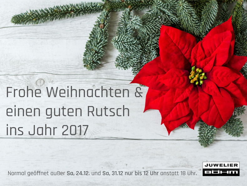 Wir wünschen Ihnen und Ihren Liebsten ein besinnliches Weihnachtsfest und einen guten Rutsch ins Jahr 2017. Wir haben für Sie normal geöffnet, außer am Sa, 24.12. und Sa, 31.12 nur bis 12 Uhr anstatt bis 18 Uhr. Bitte beachten Sie auch unsere geänderten Öffnungszeiten ab 01. Januar 2017.