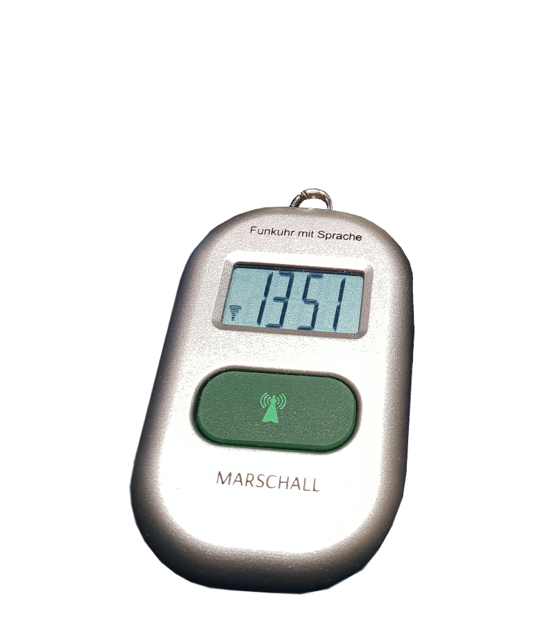Funkuhr mit Sprachfunkion - jetzt bei uns in Brühl erhältlich Die sprechende Funkuhr kann als Schlüsselanhänger oder Umhängeuhr getragen werden (Kette auf Bild nicht dargestellt). Besonders für Senioren geeignet mit der extra lauten und deutlichen Uhrzeit-Ansage. Das Display zeigt die Uhrzeit mit großen Ziffern, einfache Bedienung mit großem Knopf.